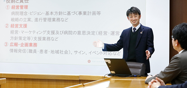 病院の管理部門(経営・企画・財務・医事・人事など)に勤務し、組織を運営します。多くの関連法規や医療機関に特有な事務などに精通して、経営戦略の立案、事業計画の策定、業務改善の提案、財務会計の見直し、在庫管理の強化、組織の活性化、人材育成など、病院経営の基盤を支え、経営の安定や収益向上などを担います。